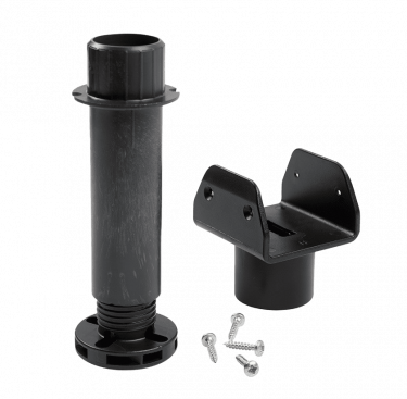 pied en plastique réglable. serait plus esthétique en métal, mais, au fond, il ne se voit pas. très facile à installer