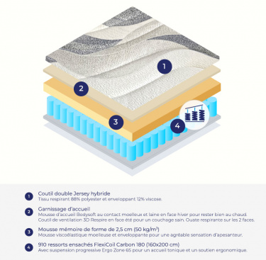 Matelas accueillant, soutien équilibré, repos parfait. Finies les douleurs lombaires